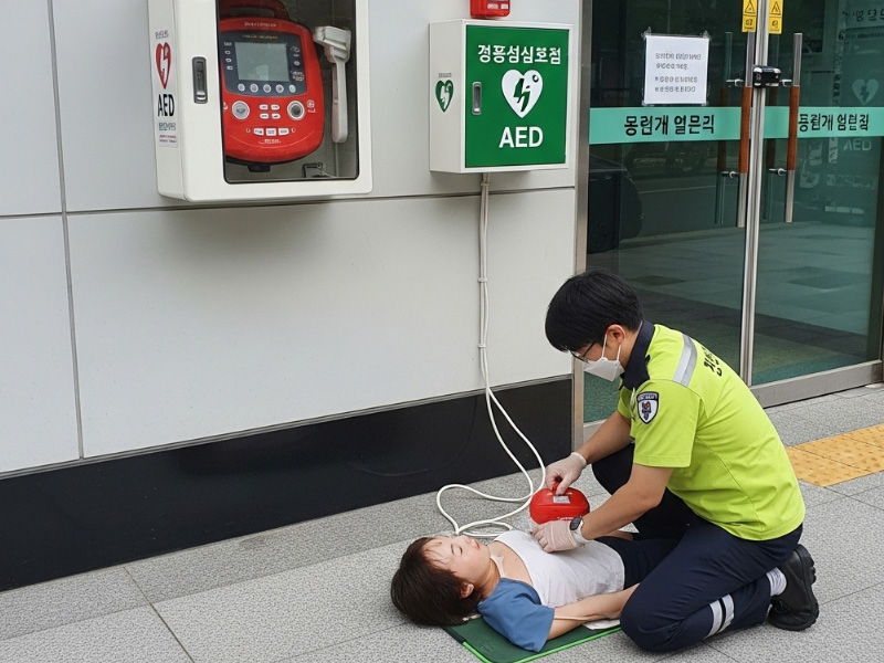 심정지 환자에게 전기 충격을 가하여 심장을 소생시키는 기기 사용법